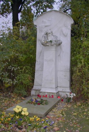 Johannes Brahms 1833 - 1897 Der am 7. Mai 1833 in Hamburg geborene Sohn eines in ärmlichen Verhältnissen lebenden Hornisten und Kontrabassisten war einer der erfolgreichsten und bedeutendsten Komponisten der Spätromantik. Schon in jungen Jahren galt Brahms als "pianistisches Wunderkind". Er erregte die Aufmerksamkeit des Geigers Joseph Joachim sowie Robert Schumanns, der sich in seiner Musikzeitschrift für ihn einsetzte. Seit 1862 lebte Brahms in Wien, dann abwechselnd in Hamburg, der Schweiz und Baden-Baden, wobei er neben seiner Kompositionstätigkeit als Pianist offiziell auftrat. 1871-74 leitete er als Dirigent die Konzerte der Gesellschaft der Musikfreunde in Wien. Seit 1878 hatte er dann ständig seinen Wohnsitz in der Donaustadt. Während seines Schaffens wurde Brahms durch seinen Kritiker-Verehrer Eduard Hanslick in den Streit gegen Bruckner und Wagner hineingezogen, obwohl er Wagner hoch einschätzte. Brahms verbindet in seinen instrumentalen und vokalen Kompositionen klassische Formenstrenge und romantische Empfindung. Er orientierte sich zwar an der Werkgerechtigkeit der alten Meister, also an Mozart, Haydn, Beethoven, Bach, Händel und Vivaldi, schuf aber dennoch durch die konstruktive Dichte seiner Kompositionen eine neue Musik, die sowohl das Schaffen Wagners als auch Schönbergs beeinflußte. Brahms, der neben vier Symphonien vor allem Kammermusik, ferner Konzerte, Gesangswerke mit Orchester, Klavier- und Orgelmusik, Chorgesänge und Klavierlieder sowie Serenaden und die "Ungarischen Tänze" schrieb. Er starb am 3. April 1897 in Wien. Brahms Grab in Wien.